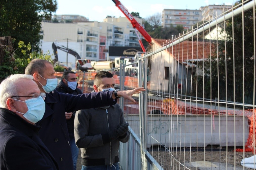 Guidé par le maire Jean Leonetti et Louis Despres, Directeur Voirie et Grands Projets de la Communauté d’Agglomération Sophia Antipolis (CASA), la visite se poursuit sur la Route de Grasse où le chantier du Bus Tram concerne la création d’une voie partagée vélos/piétons, ainsi que la rénovation de l’éclairage public et des réseaux enterrés (eaux usées, eau potable, eaux pluviales, réseaux télécoms, mise en souterrain de câbles électriques aériens…). La fin des travaux de cette première section de la route (jusqu’au collège Bertone)  est prévue pour la fin juillet 2020. « Nous effectuons ces travaux par phases parce que nous ne pouvons pas nous permettre d’embêter tous les riverains du quartier en même temps », précise Louis Despres. La deuxième devrait normalement commencer en septembre 2021…