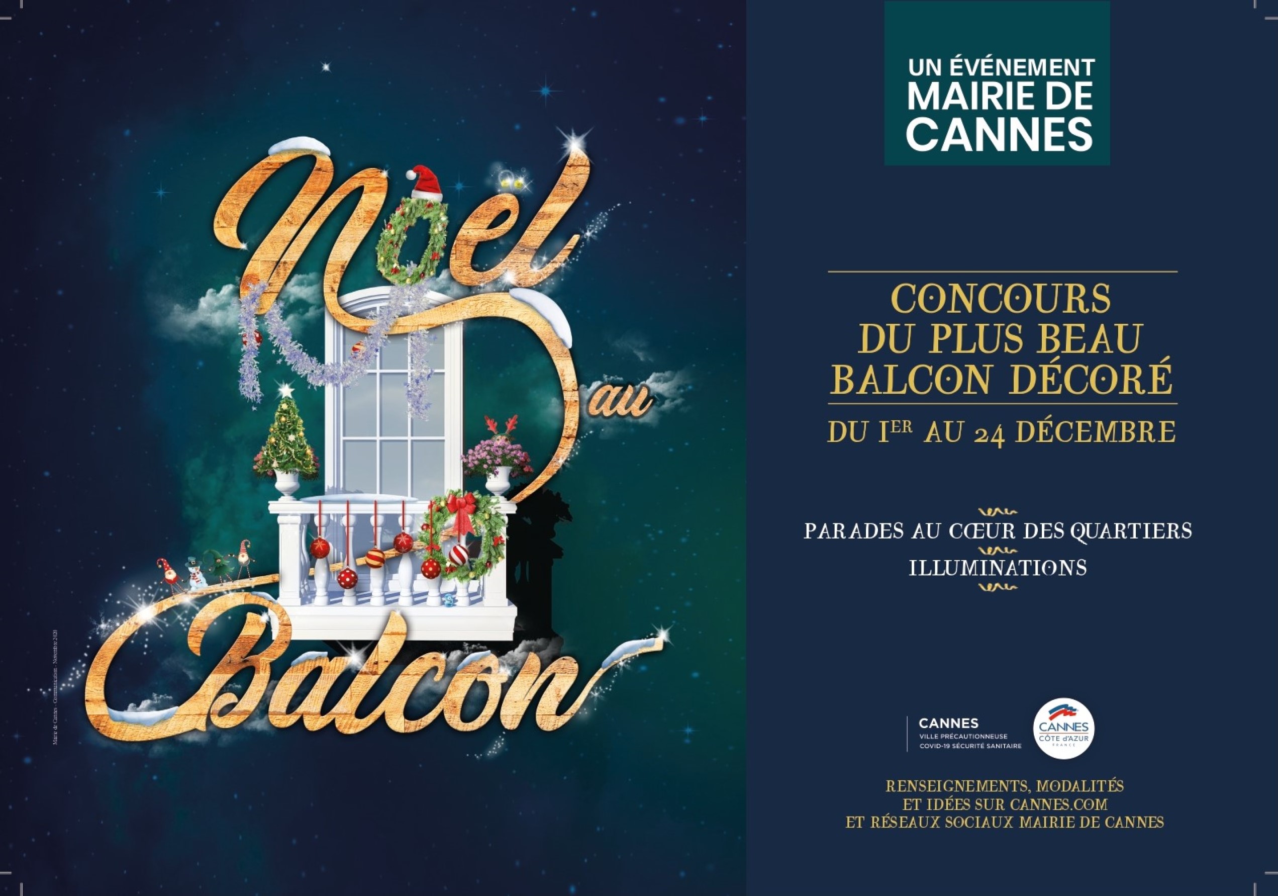 Le concours « Noël au balcon » consiste à inviter les Cannois à décorer les façades, les balcons, les jardins et fenêtres de leur domicile entre le 1er et le 24 décembre 2020. Une fois la décoration finalisée, les participants envoient une photo de leur réalisation via un formulaire disponible sur cannes.com. Les clichés seront ensuite postés au fur et à mesure sur les trois principaux réseaux sociaux de la ville. Un prix sera attribué en fonction des likes et/ou retweets et les trois premiers lauréats (1er prix Facebook, 1er prix Twitter et 1er prix Instagram) gagneront une nuitée dans un hôtel cannois ! (règlement complet sur cannes.com et en annexe).