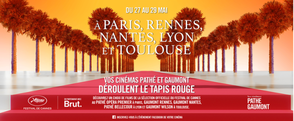 Pour la 9ème année, les films de Cannes s’invitent dans les cinémas Pathé et Gaumont pour un weekend riche en émotion placé sous le signe du 7ème art. Cette nouvelle édition, en partenariat avec Brut., sera proposée au Pathé Opéra Premier à Paris, au Gaumont Rennes, au Gaumont Nantes, au Pathé Bellecour à Lyon et au Gaumont Wilson à Toulouse.