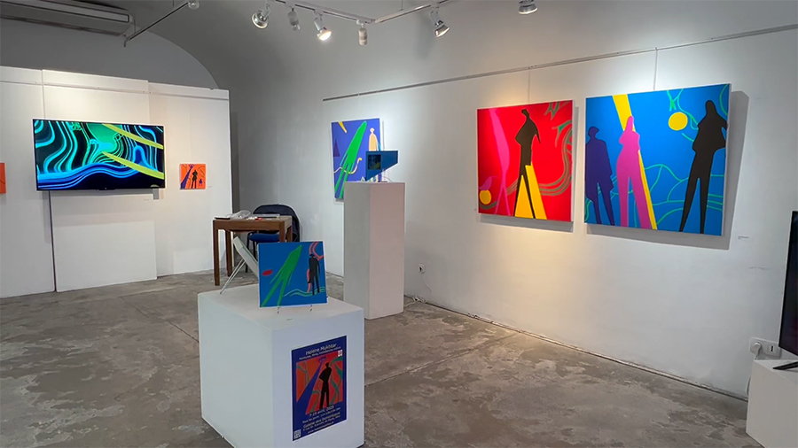 Cet ensemble de peintures, sculptures et films plonge les visiteurs dans une explosion de couleurs intenses et contrastées. Profondément marquée par ses origines méditerranéennes, Hélène Mukhtar explore la lumière et la couleur avec passion. Dans « Ombres, Couleurs et Turbulences », les oranges et les verts se marient, les mauves et les bleus dominent, souvent rehaussés de touches de jaune ou de rouge. L’énergie vibrante des couleurs s’entrelace avec des formes stylisées, des ombres noircies ou colorées, et des personnages inspirés de la bande dessinée. Ces figures évoluent dans un univers graphique peuplé d’arabesques de couleur.