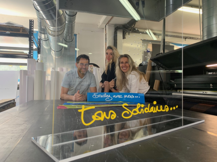 Tout s’enchaîne vite ensuite avec la Chambre de commerce et d’industrie qui commande des bandes signalétiques de distanciation sociale par milliers pour les commerçants. Suivent des panneaux signalétiques (geste barrière, gestion de déchets et hygiène des mains), clés sans contact, en acier ou plexiglas pour ouvrir les portes, appuyer sur des boutons, appeler l’ascenseur… Des cloisons de prévention amovibles translucides ou en couleurs vives pour mettre dans des restaurants, par exemple, ou encore des distributeurs sur pied. Le tout riche en couleurs, personnalisable et pour les entreprises de moins de 50 personnes, remboursables à la hauteur de 50% par l’assurance maladie ! « Tous ces produits n’existaient pas avant, raconte avec beaucoup d’enthousiasme Claire Peradotto. On les crée au fur et à mesure, presque un nouveau produit par jour. Tout s’est passé très vite, on n’avait pas le temps de se poser trop de questions, il a fallu agir. Le site marchand ren.fr a été créé en quatre jours ». Les Peradotto ont trouvé l’inspiration dans leur ADN en allant chercher du positif, ils ont su réorienter la production en fonction des besoins de la nouvelle vie de la société et des entreprises. Un garant pour assurer l’avenir de l’entreprise familiale : « Il s’agit des produits qui sont à l’origine anxiogènes, mais on les a dotés des couleurs et des messages positifs. Ils ont désormais une valeur symbolique positive pour approcher des gens. » Vous trouverez ainsi des « Brisons la glace », « Tous ensemble », « Souriez avec nous » et « Tous solidaires » enrichis par des couleurs vives, sur des matériaux translucides, des formes nouvelles pour dédramatiser, égayer le dispositif anti-Covid et recréer les liens entre les gens.
