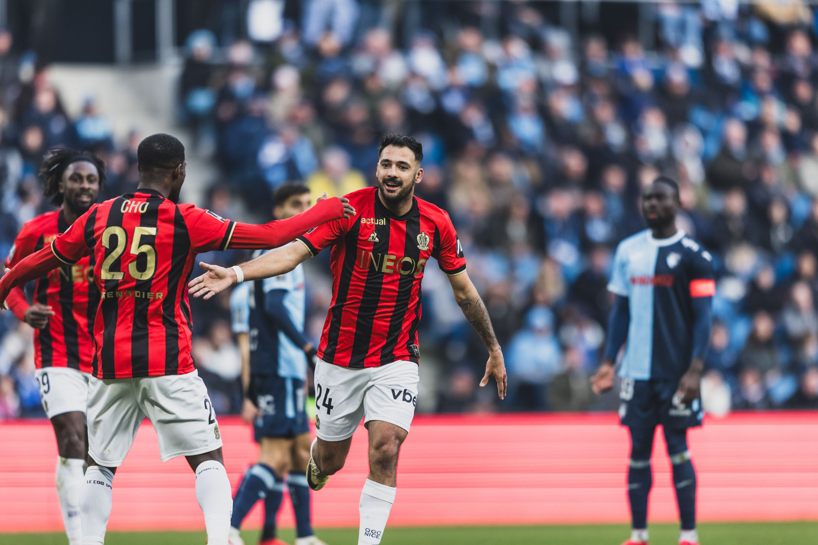 A l’entame de la partie, les Normands faisaient plus que jeu égal avec les Azuréens avec un Soumaré particulièrement en forme. Mais ce sont les Aiglons qui allaient se montrer les plus efficaces. En moins de 2 minutes, ils allaient plier le match. Tout d’abord, à la 16’, une combinaison Santamaria (merci Rennes !) avec Guessand offrait à Laborde une occasion de but que l’avant-centre Niçois n’allait pas laissait passer : 1 à 0. Gorgelin, le goal Havrais, était battu comme il le sera encore à la 18’, sur un centre de Clauss, bien servi par Guessand (encore lui !), que Kinkoué, le défenseur Normand, va tacler dans son propre but alors que Cho était à l’affût. 2 à 0 pour Nice en à peine 20 mn. Est-ce qu’un carton se dessinait comme à Marseille ou Monaco ? Sans doute que les Niçois l’ont cru et ont baissé la pression… Et ils ont été immédiatement punis par des Havrais très en jambes. Joujou, intenable, servait Diawara, qui décalait Kechta pour une frappe limpide qui battait Bulka. 2 à 1, ce sera le score à la mi-temps.