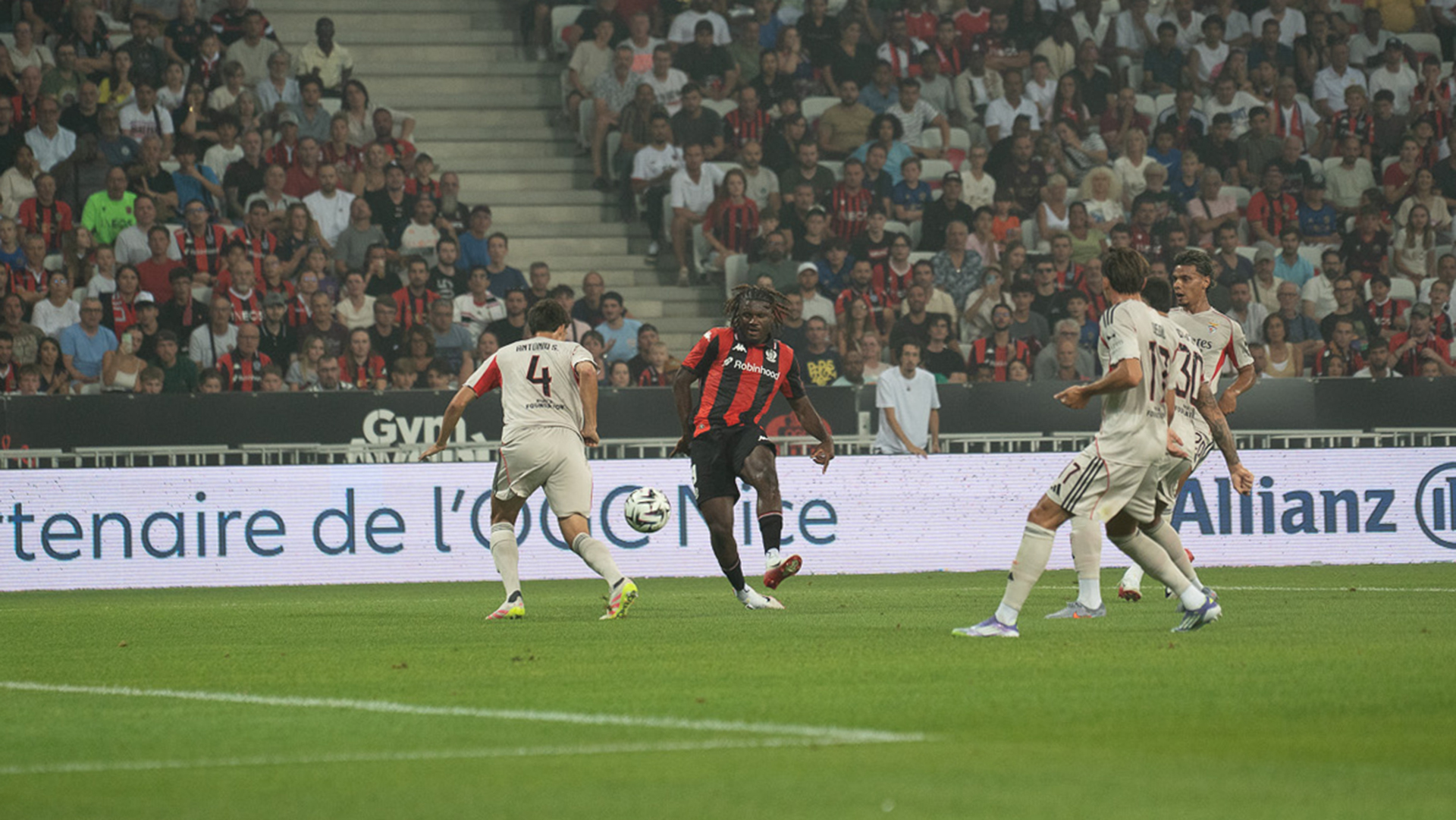 Avec un stade de l’Allianz Riviera refait à neuf comme la pelouse, une capacité réduite de 34 000 à 27 000 spectateurs pour en accroître l’ambiance, tout était fait pour une soirée de gala. Les supporters ont déployé un tifo géant de l’aigle Méfi, mascotte du club et ont donné de la voix pour soutenir leur équipe tout au long de 90 minutes qui ont pu, parfois, paraître bien longues. Mais Dante tenait sa défense, le gardien, Yevhann Diouf, a su faire les arrêts réflexes qu’il fallait… Malheureusement, à la mi-temps, une douleur derrière un genou gauche a contraint El Commandante à rester au vestiaire. C’est le jeune Oppong qui l’a remplacé alors même que quelques minutes auparavant (27’), Sanson, avait dû céder sa place suite à une choc avec Rios, les ischios seraient touché. Il a été remplacé par Louchet, trop tendre pour ce niveau de Ligue des Champions… Deux blessés de joueurs cadres pour une première rencontre officielle, cela faisait beaucoup pour une équipe qui a perdu ces deux attaquants de la saison dernière, Gaëtan Laborde et Evann Guessand parti, lui, à Aston Villa pour 35 M€, bonus compris. Si l’on rajoute Bulka, cela fait beaucoup et les arrivées ne semblent pas compenser les départs. Il faudra d’autres joueurs pour que cette équipe soit aussi compétitive que celle de l’an passé.