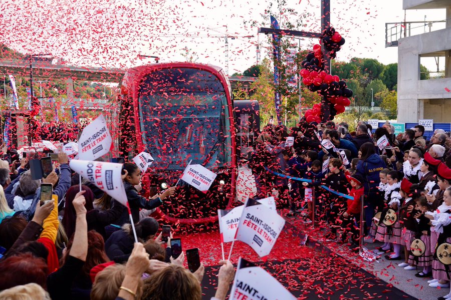 Ils étaient plus d’un millier de Niçois à accueillir le tramway à Saint-Isidore ce 13 novembre. Confettis, fanfare et enfants des différents clubs de sports étaient présents pour voir arriver le tramway au nouveau terminus de la Ligne 3. Un village avec stands et animations a été installé pour l’occasion.