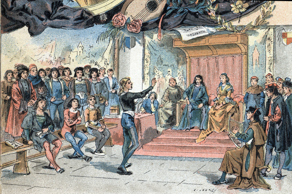 Influencée par la poésie arabe ainsi que par certains rites chrétiens du Moyen-Âge, la poésie des Troubadours est la première poésie composée en langue du peuple et non plus en langues vernaculaires issues du Latin. Les Troubadours sont des poètes du XIe au XIVe siècle qui, dans le Midi de la France, composaient en langue d’Oc des poèmes, des satires ou des ballades, avec une musique d’accompagnement (la mandore ou mandoline basse). Leur composition était rendue par des jongleurs qui les chantaient et les récitaient. Le style lyrique est léger, vif et hardi, les poèmes incarnent les idées avec originalité et enthousiasme. Les Troubadours partaient de ville en ville, de château en château, pour prôner des valeurs de la société courtoise, répondant à un idéal de société. La courtoisie est une attitude morale liée au rang de la noblesse. C’est la vertu, la loyauté, la générosité.