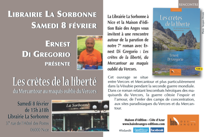 A l’occasion de la parution du 7e roman Les Crêtes de la Liberté, du Mercantour au maquis oublié du Vercors, la Maison d’édition Baie des Anges organise à la librairie la Sorbonne avec l’auteur Ernest Di Gregorio, une rencontre le samedi 8 février 2020 de 15h à 18h, au 37 rue de l’Hôtel des Postes à Nice.