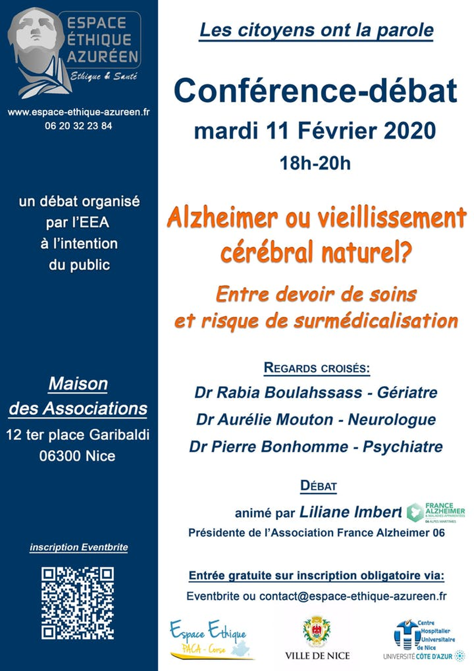 Une conférence-débat est organisée par l’Espace éthique Européen à la Maison des Associations où chaque citoyen pourra prendre la parole au cours d’un débat animé par Mme Liliane Imbert, présidente de l’association France-Alzheimer 06, en présence du Dr Aurélie Mouton, neurologue, Dr Rabia Boulahssass, gériatre et du Dr Pierre Bonhomme, psychiatre.